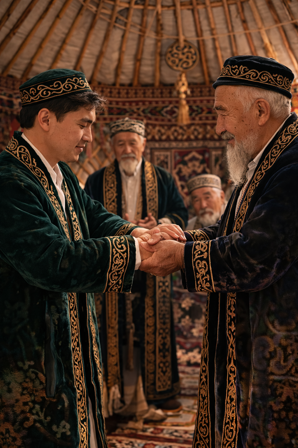 Қазақтардың ер адамдар ортасында амандасудың бірнеше түрі қалыптасқан. С.С. Тәтібаев «қол алысып амандасу» немесе «қол алысу» ишарасын атап көрсетеді. Тарихи тұрғыдан бұл амандасу араб тілінен енген «ассалаумағалейкүм» — «сізге бейбітшілік болсын» деген сөзбен қатар жүреді: жасы кіші адам үлкенге қарай екі қолын ашық алақанымен соза жақындайды. Үлкен адам да жауап ретінде екі қолын созып, «уағалейкум ассалам» — «сізге де бейбітшілік болсын» деп жауап береді де, қол алысады [9, 72-б.]. Мұнда негізгі рөлді оң қол атқарады, ал сол қол қосымша, нығайтушы қызметте көрінеді. Мұны ықшам нұсқадан да аңғаруға болады: тек оң қолды ұсыну — «қол беру». А. Байбурин мен А. Топорков [1] ишараларда оң жақтың артықшылығы бар екенін атап көрсеткен: моңғолдарда оң қол — «құт-береке беруші», сондықтан тек сол қолмен береді және қабылдайды; мұсылман халықтарында ол ғұрыптық тұрғыдан «таза» саналып, ас ішуде қолданылады; қазақтар да босағаны тек оң аяқпен аттайды. Ш.Ж. Тоқтабаева оң қолдың құрметті қол екенін, сыйлықтың да сол қолмен ұсынылып, қабылданғанын, ал сол қолдың жеке гигиеналық рәсімдерге қолданылғанын жазады [10, 44-б.].